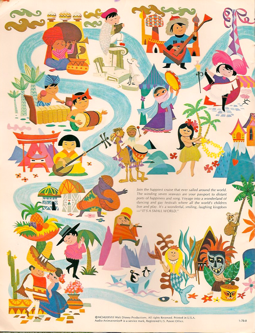 I just went to the storage unit to get some stuff out, and I found my Small World brochure from when I went to Disneyland as a kid! The Small World was my favorite ride at Disneyland, and we went on it multiple times, because I loved it so much. I loved all the characters and the idea of the world being a peaceful and friendly place. I guess I still do like that idea! lol. Here are a couple of pics from the brochure. I love the artwork! Click the pics to enlarge. :)