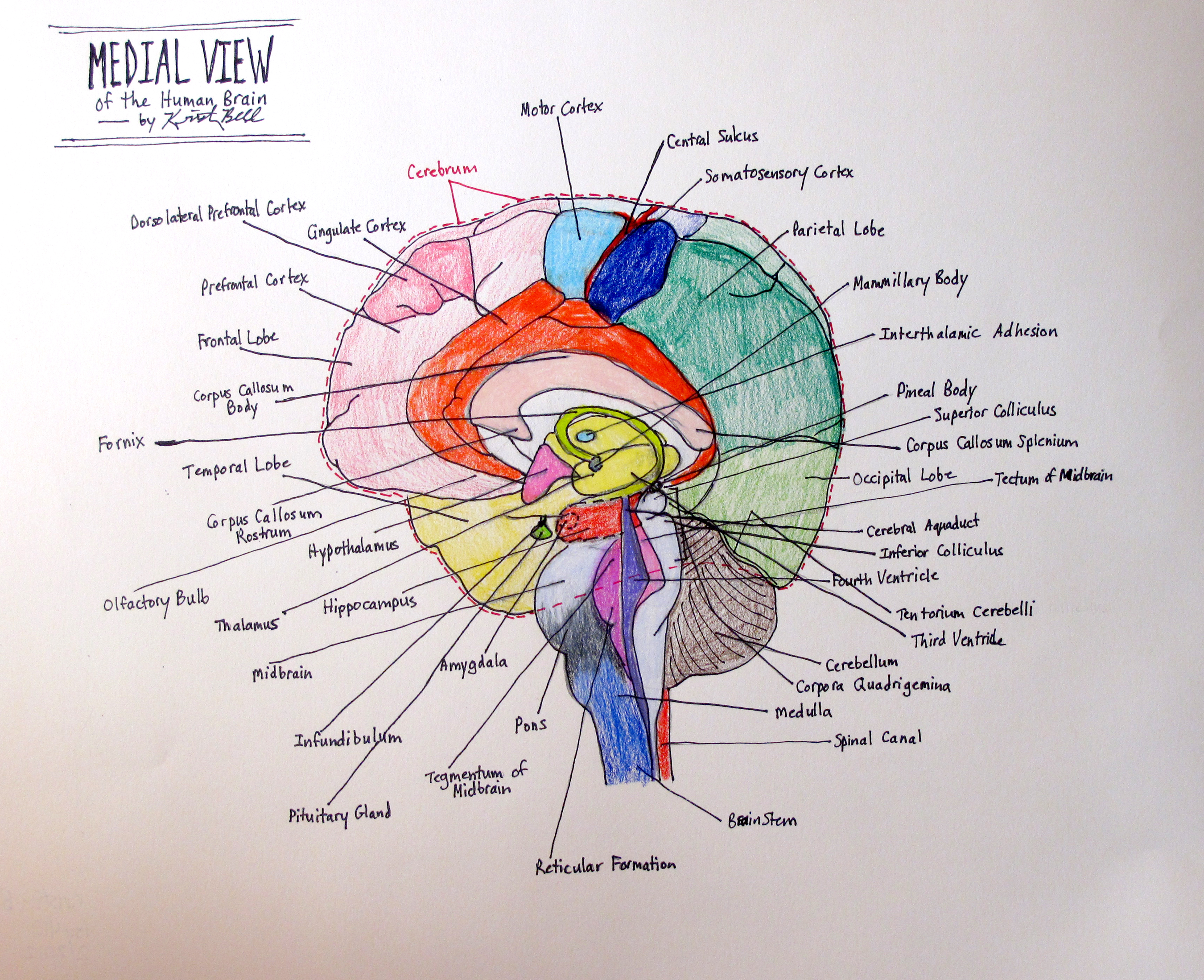 Academic, Art, Brain, cerebellum, Colorful, drawings, Education, frontal lobe, gyrus, Illustrated, Kristin Bell, Medial view of human brain, medulla oblongata, neuroscience, occipital lobe, parietal lobe, Prefrontal Cortex, Psychology, temporal lobeI’m not quite sure if I got all of the parts in the right spots for this one. It is pretty hard to draw from multiple images and get everything in one pic. This is supposed to be the medial view of the human brain. :) Click the pic to enlarge.