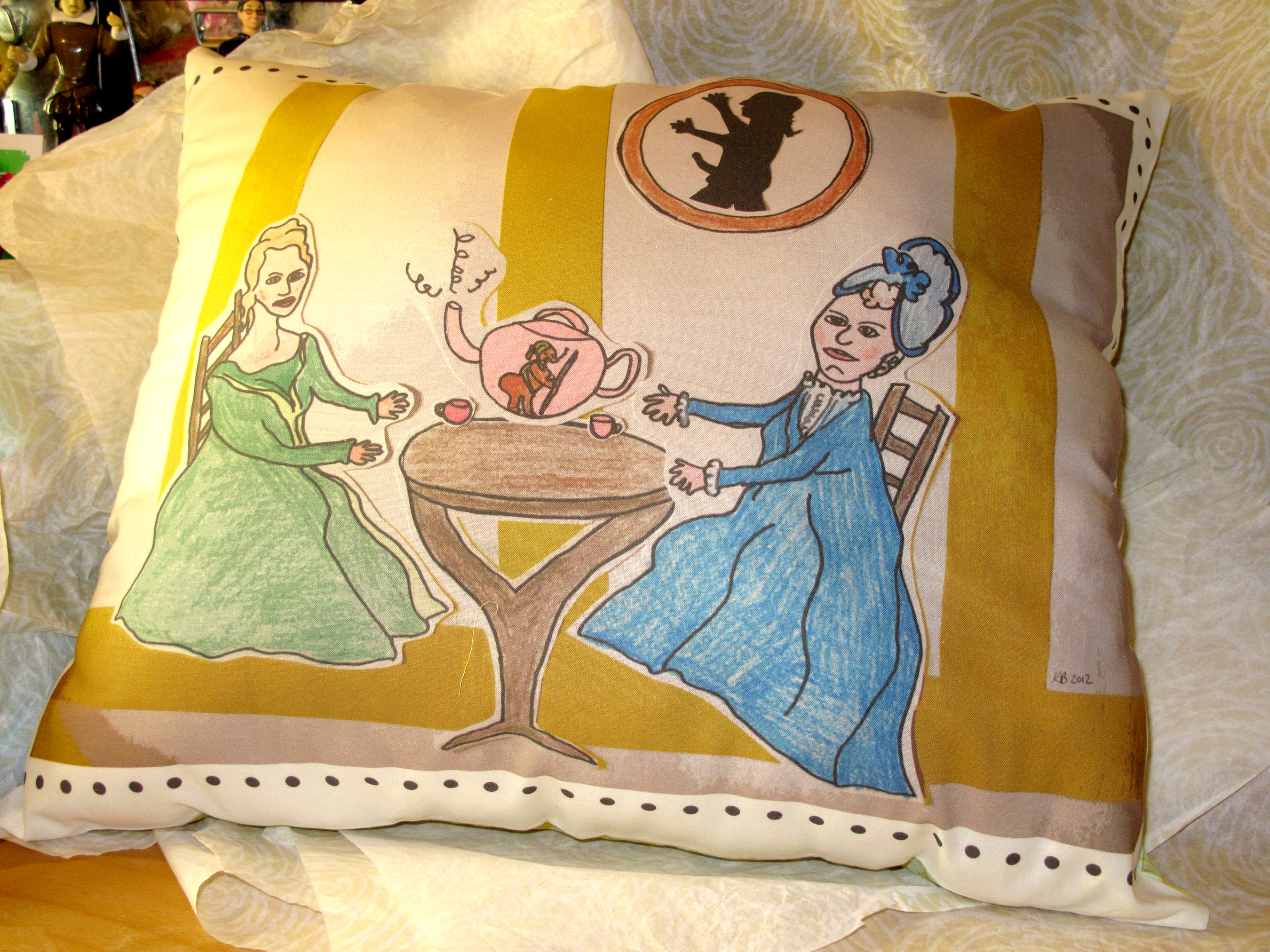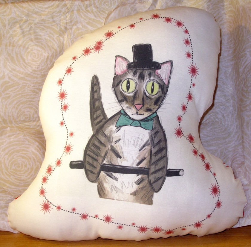 2012, Angelica Kauffman, Art, art history, artist, arts & crafts, body parts, Cat Break, Cats, craft, creative, cuddle, Cute, Decorating, design, design your own fabric, drawings, fabric, fabric design, feline, female, feminist, for sale, Fun, funny, gender, Goofy, Grrls/Women, Handmade, Happy, Humor, In Other Words, Kristin Bell, Magic, Mary Moser, pillow, Pillows, plushies, Portland, sewing, sewnHere are some new pillows I’ve been working on. I’m going to be selling on consignment at In Other Words in Portland, Oregon. I’m pretty excited about it! The first one is Henry Miller Magic cat with red stripes. The second one is Judy the Utie(rus) with minis on the back. The third one is a pillow of Angelica Kauffman and Mary Moser having tea.