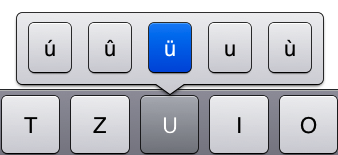 I just got my iPad for Christmas and am finding out new things every day. I just wanted to post this in case someone was wondering how to use accents and diacritically marked letters while typing on iPad, such as ü, é, ñ and all sorts of other ones. I stumbled onto this by accident, but all you have to do when using the keypad is to hold down the letter until a window pops up where there are alternate letters and just click on the letter you would rather have! So, just hold the letter slightly longer than normal and the window will pop open. It is FANTASTIC!!!