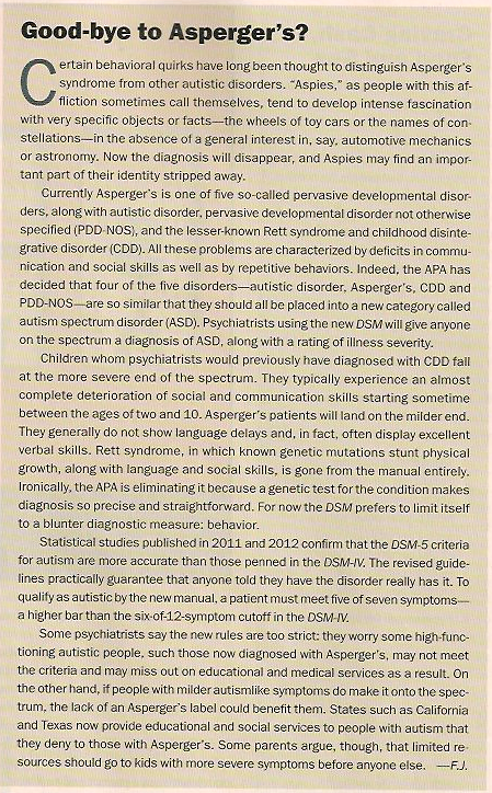 2012, Asperger's, Aspies, DSM-5, Kristin Bell, Mental Health, Mental Illness, neuroscience, Psychiatry, Psychology, revisionsI was just posting about this on Facebook, so I thought I’d drop a note about it here too. According to Scientific American Mind, May/June 2012, one of the changes that is coming to the DSM-5 (aside from dropping the roman numerals) is that they will be getting rid of the category of Asperger’s. Instead, people with this disorder will be labeled on a spectrum disorder with levels of severity noted. I’m including the short article here, so you can read more about it. It was kind of surprising to me to hear about this. I know that there are a lot of people with Asperger’s who have parts of their identity wrapped up in the diagnostic criteria. It would be like them getting rid of schizophrenia I guess. Suddenly some part of your identity is renamed. It is kinda strange. I don’t know if it is good or bad. That is part of the tricky thing about mental disorders and labels…most people with a mental disorder usually wind up having some part of their identity tied to a label. For good or bad or whatever…it just seems to happen.