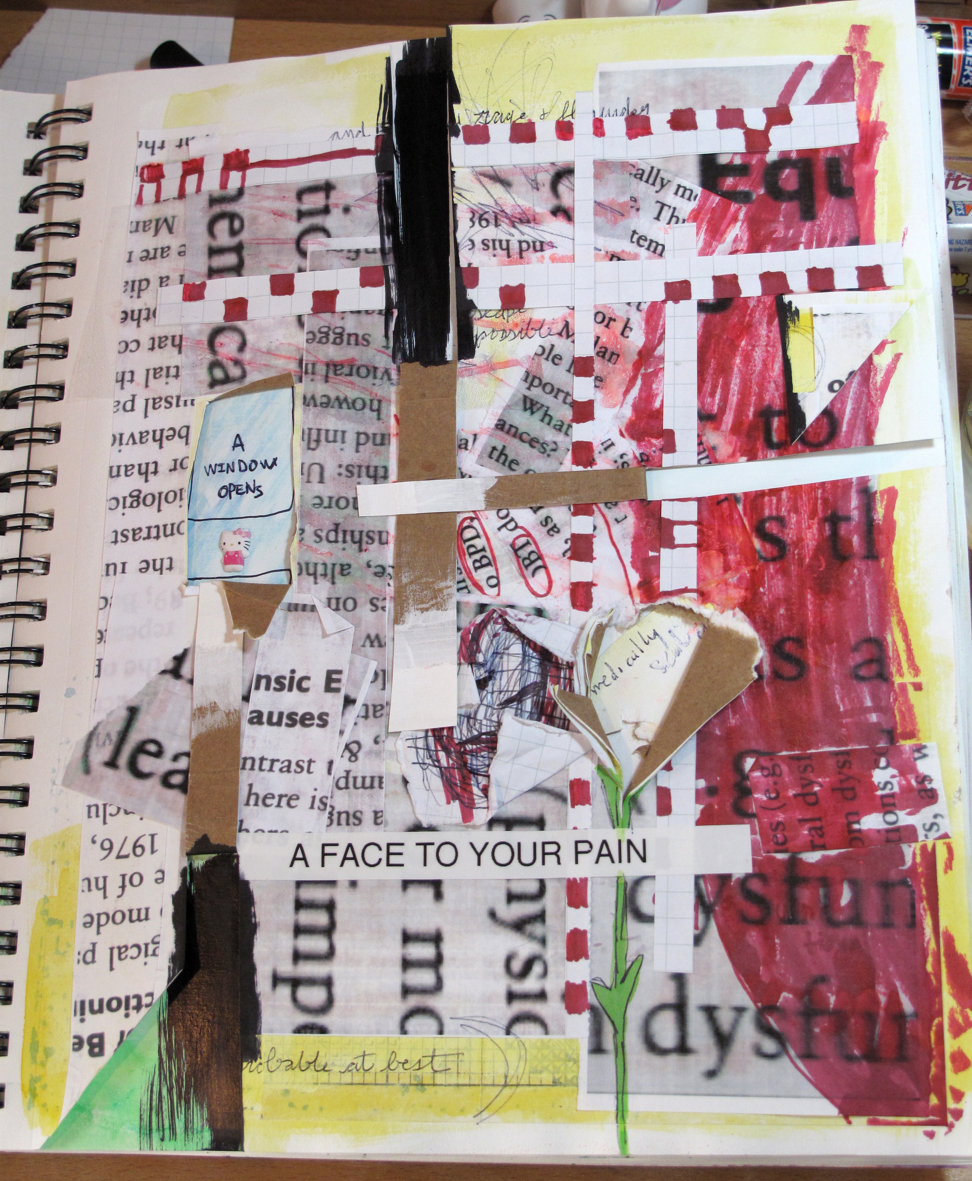 I was reading a book by Marsha Linehan, the creator of Dialectical Behavior Therapy treatment for people with Borderline Personality Disorder, and I was struck by the theoretical concepts that she was discussing in the book. At the same time, I had been thinking about my friend who has BPD. I thought about the unending pain she suffers and how there is so much rage and turmoil in her life. I wanted to incorporate both Linehan’s concepts and aspects of my friend into the art journal that I just started working on as a collaboration with my friend, John.